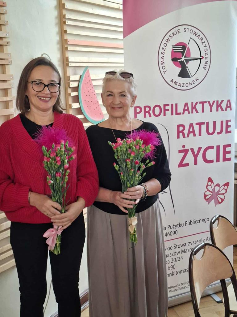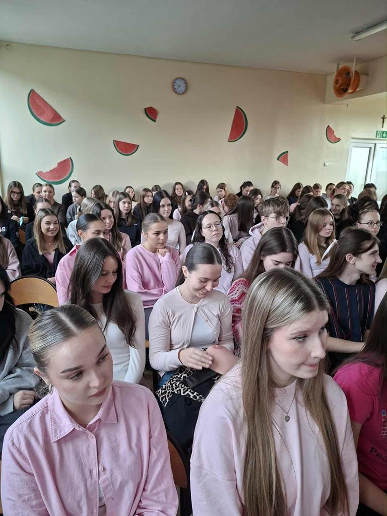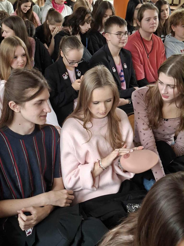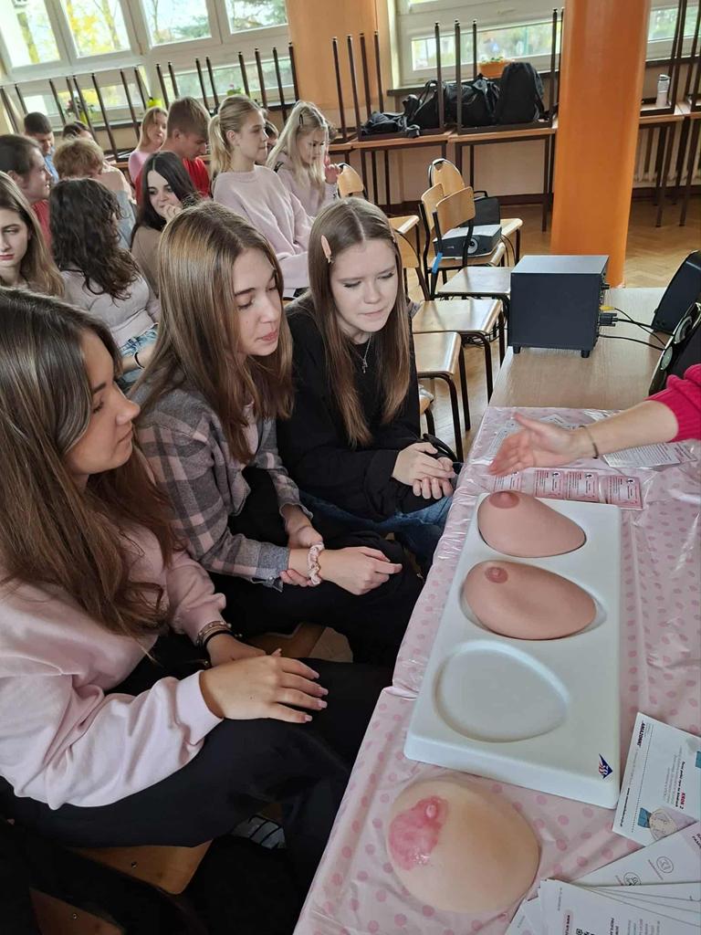 W ramach akcji "Październik Miesiącem Walki z Rakiem Piersi" klasy 4 b-ch oraz dziewczęta z klas 4 men, 4 i-m, 4 m-ch i 1 hp uczestniczyły w spotkaniu z przedstawicielkami Tomaszowskiego Stowarzyszenia Amazonek zorganizowanym przez Panią Kingę Marcińczak i Panią Annę Wojciechowską. Uczniowie zapoznali się z czynnikami ryzyka tego nowotworu, sposobami leczenia, a co najważniejsze z zasadami jego profilaktyki. Dziewczęta miały możliwość na fantomach piersi nauczenia się technik samobadania i wykrywania zmian.