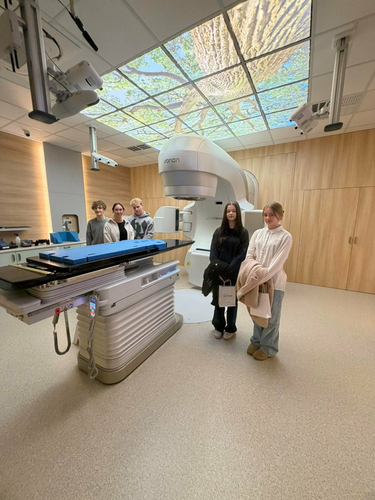 W ramach projektu "Przyspieszenie procesu transformacji cyfrowej" nasi uczniowie uczestniczyli w spotkaniu w Specjalistycznym Szpitalu Onkologicznym NUMED w Tomaszowie Mazowieckim, którego celem było podniesienie ich kompetencji cyfrowych oraz zapoznanie się z zasadami bezpiecznego korzystania z Internetu. Uzyskali informację w jaki sposób dane medyczne są chronione w nowoczesnych podmiotach leczniczych. Szczególnym punktem wydarzenia była prezentacja nowoczesnego akceleratora liniowego – aparatu do radioterapii. Młodzież poznała, jak wygląda urządzenie służące do leczenia nowotworów, dowiedziała się jakie są etapy procesu terapeutycznego oraz jak technologie cyfrowe wspierają precyzyjne planowanie i prowadzenie leczenia. Dzięki spotkaniu uczniowie zrozumieli znaczenie cyberbezpieczeństwa we współczesnym świecie oraz rozbudzili swoje zainteresowania medycyną.