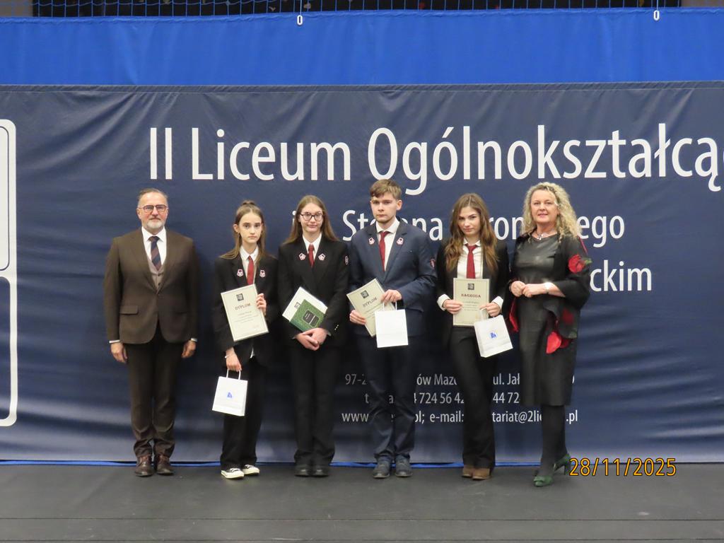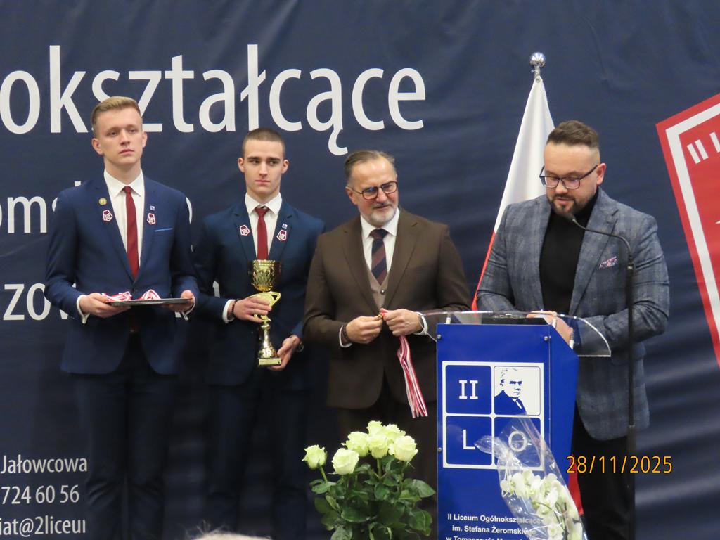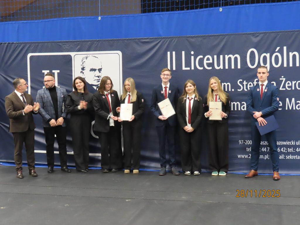 W ostatniej części uroczystości Pani Adrianna Jachimowska przedstawiła laureatów XXXI edycji Ogólnopolskiego Konkursu "O Literacki Laur Arbuza" (o którego wynikach można przeczytać w oddzielnym artykule), Pani Anna Ignasiak zaprezentowała laureatów konkursu wiedzy o Stefanie Żeromskim (pierwsze miejsce zajęła Amelia Magiera z klasy IV h-d, drugie Piotr Kiełbowski z klasy IV h-d, trzecie Kinga Nowak z klasy III b-ch (M), natomiast wyróżnienie Maria Wiktorowicz z klasy III men). Pan Marcin Krawul przedstawił laureatów konkursu na najładniejszą pracownię, który wygrała klasa I informatyczno-menedżerska, a także zwycięzców siatkarskiego turnieju o Puchar Dyrektora II LO, którymi zostali uczniowie klasy III men.