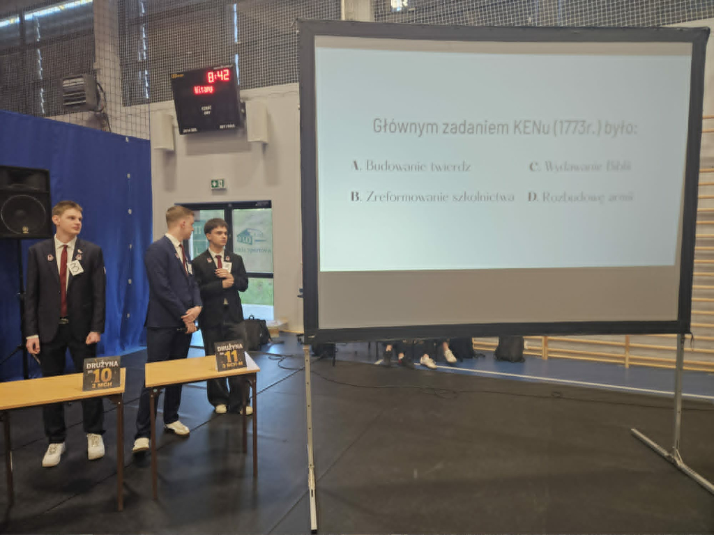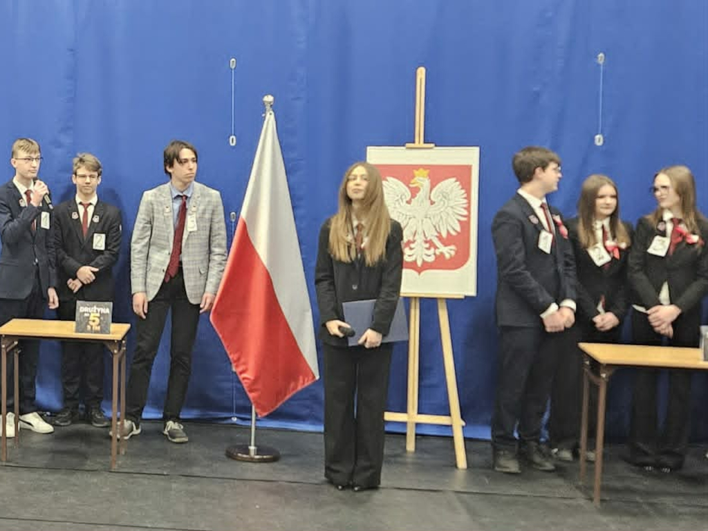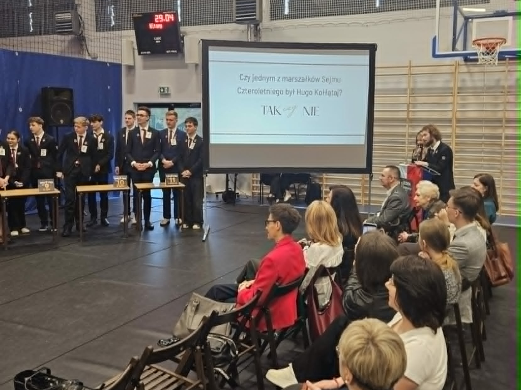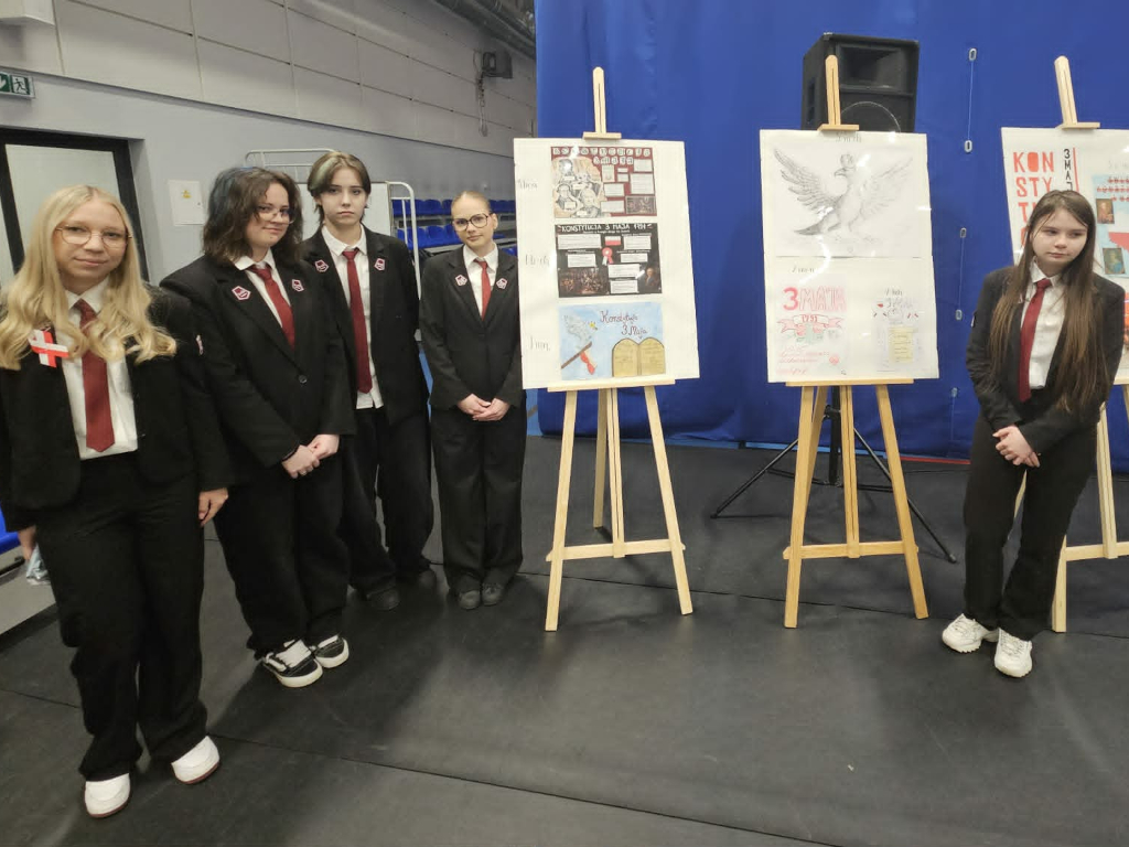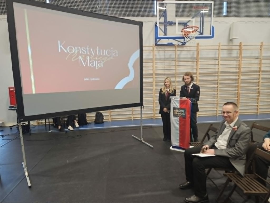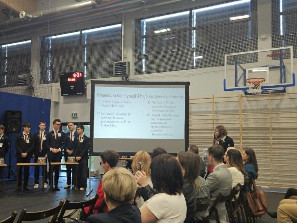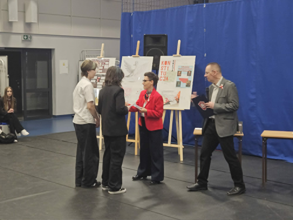 29 kwietnia w naszej szkole odbyła się uroczystość upamiętniająca 235. rocznicę uchwalenia Konstytucji 3 Maja. Obchody otworzył hymn państwowy odśpiewany przez zebranych w hali uczniów i nauczycieli. W formule apelu znalazły się fragmenty poezji okolicznościowej z tamtego czasu, próbka publicystyki Sejmu Wielkiego i pieśni wyrażające entuzjazm towarzyszący uchwaleniu ustawy zasadniczej. W tym ostatnim aspekcie organizatorów – klasę III h-d wsparł chór szkolny. Rozstrzygnięto także konkurs na plakat: I miejsce – Wiktoria Ostrowska, II miejsce – Joanna Bąbka i Maja Karp, III lokata – Magdalena Ostrowska. Jury przyznało Kindze Gajewskiej wyróżnienie. Ostatnim punktem obchodów była rywalizacja drużyn z poszczególnych klas bazująca na znanym telewizyjnym teleturnieju, u nas w wersji "1 z 11". Rolę Tadeusza Sznuka wziął na siebie i sprostał temu trudnemu zadaniu Piotr Kwiatkowski, będąc i prowadzącym, i ekspertem merytorycznym. Zwycięska drużyna to uczniowie z klasy 3 men.